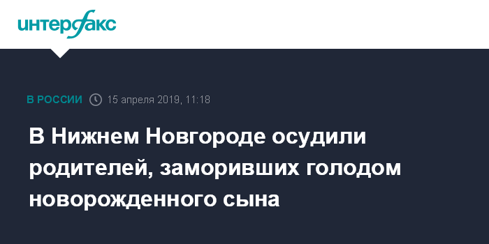 Москва. 15 апреля. INTERFAX.RU - Суд в Нижнем Новгороде вынес приговор семейной паре, которая не кормила своего новорожденного ребенка, в результате чего он погиб, сообщает в понедельник региональное управление СК.
