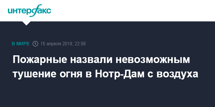 Москва. 15 апреля. INTERFAX.RU - Пожарные не могут сбрасывать воду на Собор Парижской Богоматери с воздуха, так как это могло бы привести к обрушению всего здания, сообщили в понедельник в службе гражданской обороны Франции.