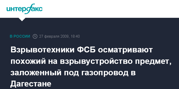 Махачкала. 27 февраля. INTERFAX.RU - В Каякентском районе Дагестана взрывотехники УФСБ приступили к проверке информации о том, что недалеко от населенного пункта Инчхе заминирован газопровод Моздок-Газимагомед, сообщили "Интерфаксу" в Группе общественных связей (ГОС) УФС России по Дагестану.