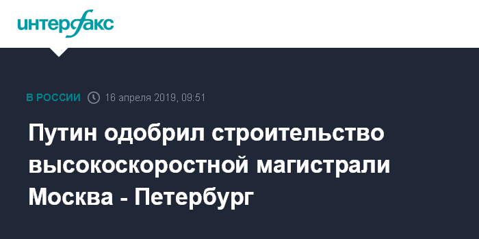 Москва. 16 апреля. INTERFAX.RU - Владимир Путин поддержал начало проектирования высокоскоростной железнодорожной магистрали (ВСМ) Москва - Санкт-Петербург, пишет во вторник газета "Коммерсантъ".