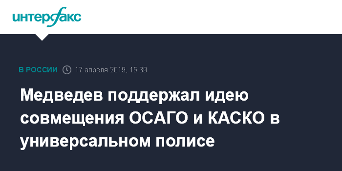 Москва. 17 апреля. INTERFAX.RU - Премьер-министр РФ Дмитрий Медведев назвал разумной идею создания универсального полиса для автомобилистов, который бы сочетал защиту, обеспечиваемую полисом ОСАГО и полисом добровольного страхования КАСКО.