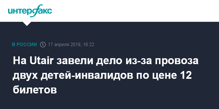 Москва. 17 апреля. INTERFAX.RU - Два административных дела завели на авиакомпанию Utair, которая заставила жительницу Хабаровска оплатить дополнительные посадочные места для того, чтобы перевезти двух своих детей-инвалидов, сообщает в среду Уральская транспортная прокуратура
