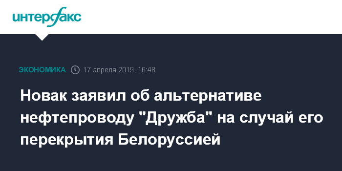 Москва. 17 апреля. INTERFAX.RU - Вариант перекрытия Белоруссией транзита нефти из РФ по нефтепроводу "Дружба" это нецелесообразный форс-мажор, заявил журналистам министр энергетики РФ Александр Новак.