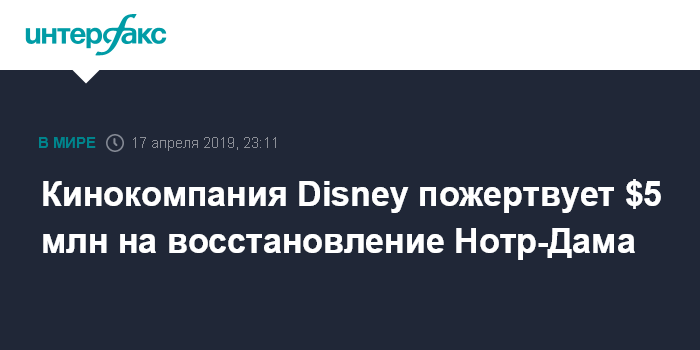Москва. 17 апреля. INTERFAX.RU - Американский медиа-конгломерат The Walt Disney Company в среду объявил, что направит $5 млн на восстановление пострадавшего от мощного пожара Собора Парижской Богоматери в столице Франции, пишет The Hill.