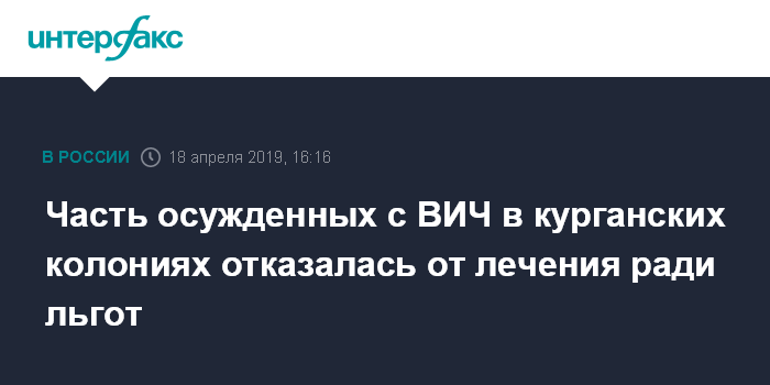 Москва. 18 апреля. INTERFAX.RU - Часть осужденных с ВИЧ-инфекцией, отбывающих наказание в курганских колониях, отказываются принимать лекарственные препараты, желая получать государственные льготы по инвалидности, сообщает пресс-служба УФСИН России по региону в четверг.