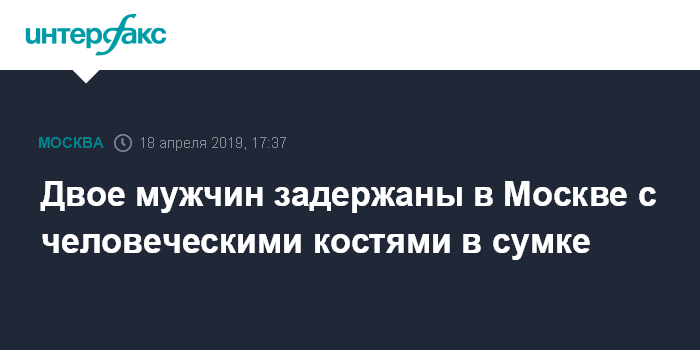 Москва. 18 апреля. INTERFAX.RU - Полицейские задержали на востоке Москвы двоих мужчин с останками скелета человека в сумке, сообщила представитель столичного главка Следственного комитета (СК) Юлия Иванова.