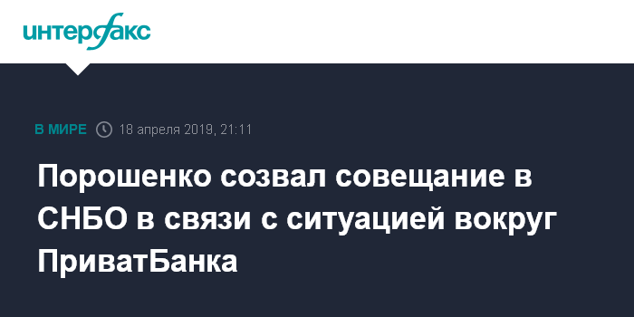 Москва. 18 апреля. INTERFAX.RU - Президент Украины Петр Порошенко в 21:00 четверга проведет совещание в Совете национальной безопасности и обороны в связи с ситуацией вокруг ПриватБанка, сообщается в аккаунте главы государства в твиттере.