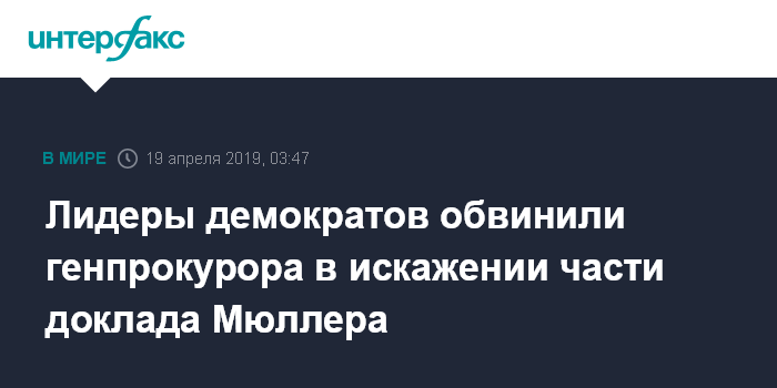 Также Пелоси и Шумер подчеркивают, что генпрокурор не прав, утверждая о сотрудничестве президента со спецпрокурором Р.Мюллером в его расследовании.