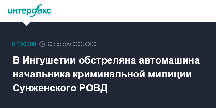 Назрань. 28 февраля. ИНТЕРФАКС-ЮГ - В станице Оржоникидзевская Сунженского района Ингушетии в 8:25 мск неустановленные лица из автоматического оружия и гранатометов обстреляли автомашину начальника криминальной милиции Сунженского РОВД Магомеда Евлоева.
