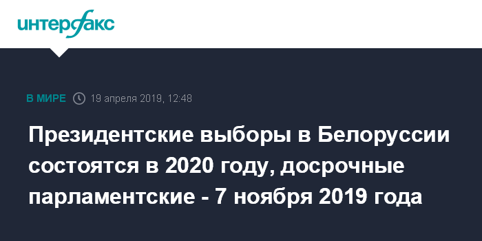 Москва. 19 апреля. INTERFAX.RU - Президент Белоруссии Александр Лукашенко сообщил, что очередные президентские выборы в стране состоятся осенью 2020 года, а парламентские выборы будут досрочными.