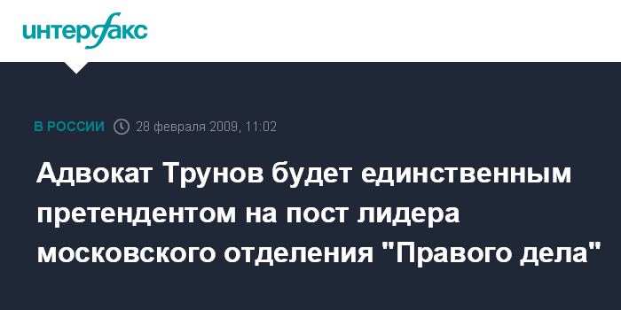 Москва. 28 февраля. INTERFAX.RU - Сопредседатель "Правого дела" Георгий Бовт, который занимался организацией учредительной конференции московского отделения партии, подтвердил "Интерфаксу", что единственным кандидатом на пост его лидера будет адвокат Игорь Трунов.