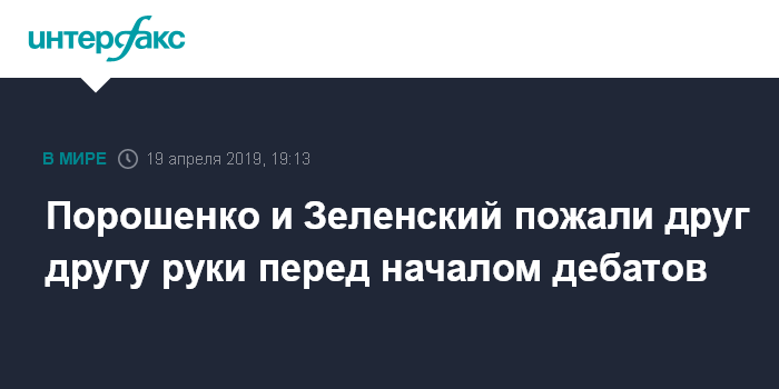 Москва. 19 апреля. INTERFAX.RU - Кандидаты в президенты Украины Петр Порошенко и Владимир Зеленский пожали руки и начали дебаты на одной сцене команды Зеленского НСК "Олимпийский".
