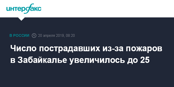 Москва. 20 апреля. INTERFAX.RU - Число пострадавших в результате перехода природного пожара из Монголии на поселки в Забайкалье достигло 25 человек.