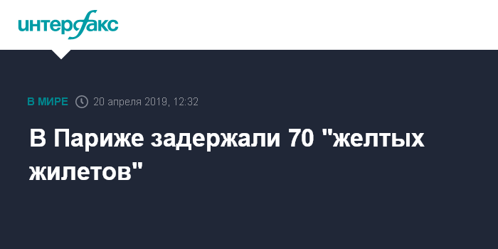 Москва. 20 апреля. INTERFAX.RU - Парижская полиция задержала 70 человек на акциях, организованных утром в субботу "желтыми жилетами", сообщает телеканал BFM TV со ссылкой на полицию.
