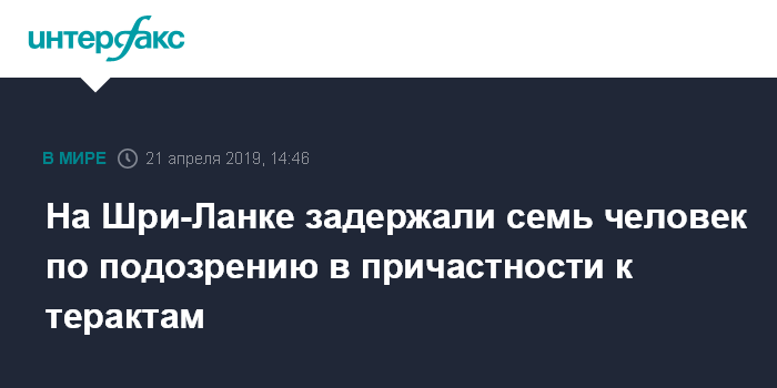 Москва. 21 апреля. INTERFAX.RU - Правоохранительные органы Шри-Ланки задержали семь человек, предположительно, причастных к произошедшим ранее терактам, передают в воскресенье местные СМИ.