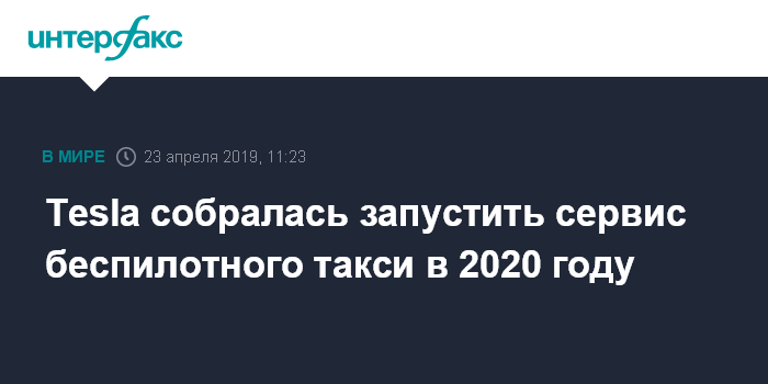Москва. 23 апреля. INTERFAX.RU - Компания Tesla Inc. планирует запустить сервис беспилотного такси в 2020 году, пишет газета The Wall Street Journal со ссылкой на заявление основателя и главы компании Илона Маска.
