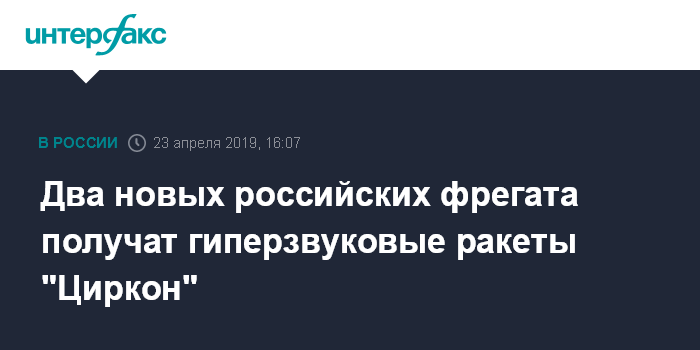 Москва. 23 апреля. INTERFAX.RU - Гиперзвуковое оружие будет установлено на двух новых российских фрегатах "Адмирал Амелько" и "Адмирал Чичагов" - об этом объявлено на церемонии закладки этих кораблей во вторник на "Северной верфи" в Санкт-Петербурге. Церемония прошла с участием президента РФ Владимира Путина.