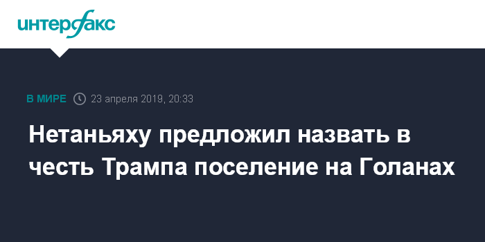 Москва. 23 апреля. INTERFAX.RU - Премьер-министр Израиля Биньямин Нетаньяху предложил назвать одно из израильских поселений на Голанских высотах в честь президента США Дональда Трампа, который признал суверенитет Израиля над Голанами, передают израильские СМИ.