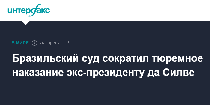 Москва. 24 апреля. INTERFAX.RU - Верховный суд Бразилии сократил тюремный срок до 8 лет и 10 месяцев бывшему президенту страны Луису Инасиу Луле да Силве по уголовному делу о коррупции, сообщил во вторник телеканал France 24.