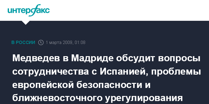 Медведев в Мадриде обсудит вопросы сотрудничества с Испанией, проблемы европейской безопасности и ближневосточного урегулирования