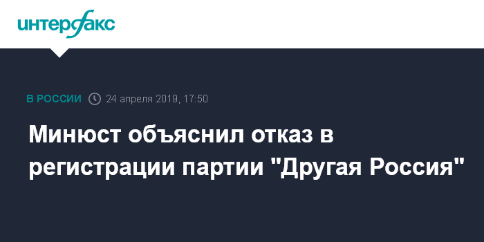 Ранее в среду пресс-секретарь незарегистрированной партии "Другая Россия" Мария Свердлова сообщила "Интерфаксу", что Минюст отказал в регистрации партии. По ее словам, в качестве причины отказа, министерство назвал "формальные ошибки в заполнении форм документов и опечатки".