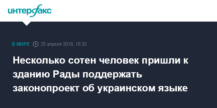 Москва. 25 апреля. INTERFAX.RU - Акция за принятие законопроекта об украинском языке проходит в четверг утром у здания Верховной Рады, передает корреспондент "Интерфакса".