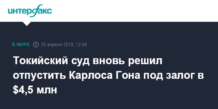 Москва. 25 апреля. INTERFAX.RU - Экс-глава Nissan Карлос Гон может вновь оказаться на свободе в четверг: суд Токио принял решение освободить его под залог в 500 млн иен ($4,5 млн).