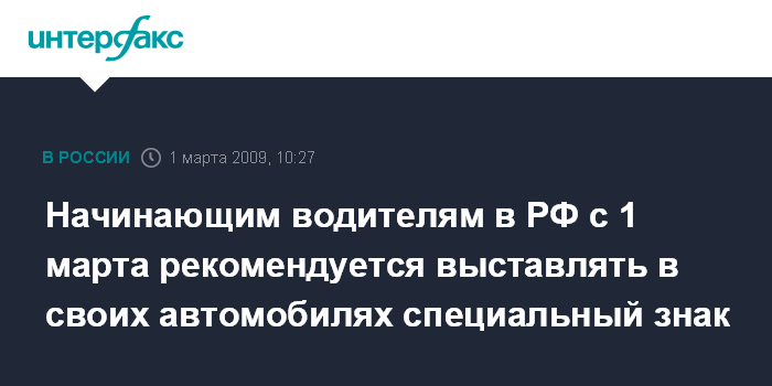 Москва. 1 марта. INTERFAX.RU - В России с 1 марта 2009 года для начинающих водителей вводится специальный знак.