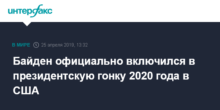 Москва. 25 апреля. INTERFAX.RU - Бывший вице-президент США Джо Байден в четверг объявил о намерении баллотироваться в президенты страны на выборах 2020 года, сообщает в четверг The Hill.