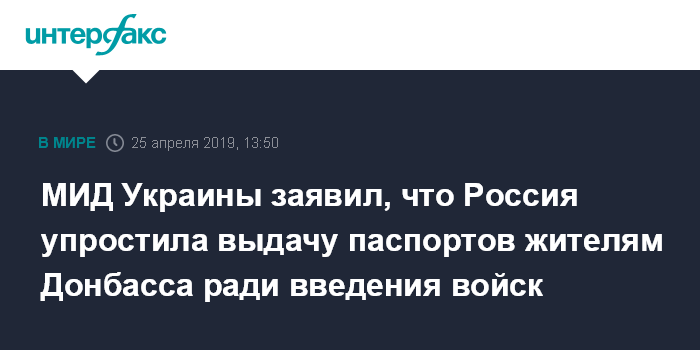 Москва. 25 апреля. INTERFAX.RU - Министр иностранных дел Украины Павел Климкин считает, что упрощение Россией процедуры предоставления гражданства жителям Донбасса - способ создать возможность для военного вмешательства.