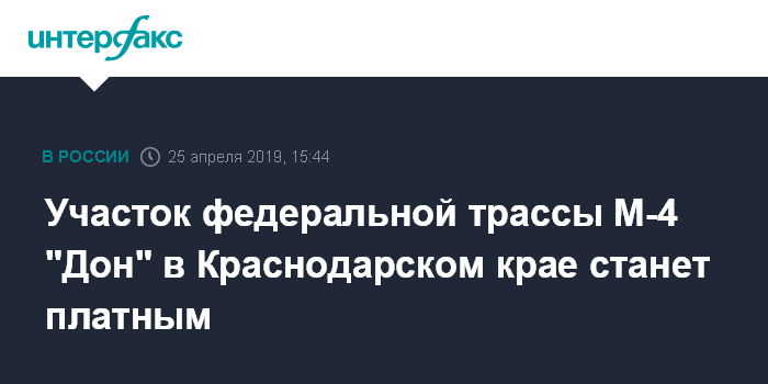 Москва. 25 апреля. INTERFAX.RU - Режим платной эксплуатации вводится на участке "1195 км - 1319 км" федеральной автомобильной дороги М-4 "Дон" в Краснодарском крае, сообщила пресс-служба ГК "Автодор".