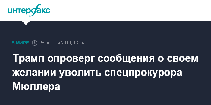 Москва. 25 апреля. INTERFAX.RU - Президент США Дональд Трамп опроверг информацию о том, что просил своего советника при Белом доме Дона Макгана отстранить спецпрокурора Роберта Мюллера от расследования так называемого "российского дела".