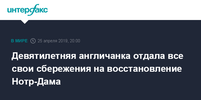 Москва. 25 апреля. INTERFAX.RU - Юная жительница Великобритании направила французскому фонду сохранения культурного наследия все свои скромные сбережения для восстановления собора Парижской Богоматери, сообщает в четверг телеканал BFM TV.