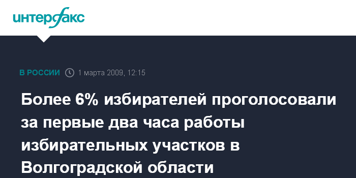 Волгоград 1 марта. INTERFAX.RU - Явка избирателей на выборы депутатов Волгоградской областной Думы за два часа с момента открытия избирательных участков составила 6,28 %.
