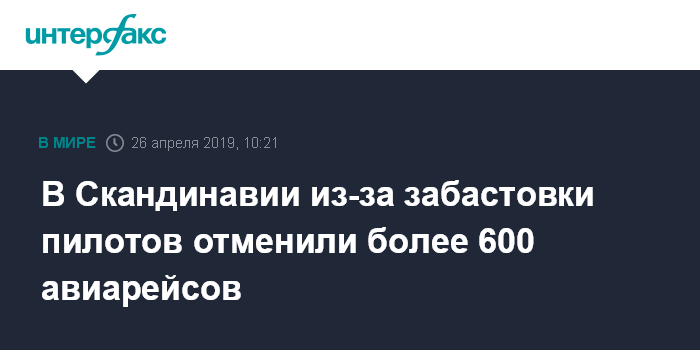Москва. 26 апреля. INTERFAX.RU - Более 600 прибывающих и отбывающих авиарейсов отменили в Швеции, Дании и Норвегии в связи с забастовкой пилотов авиакомпании Scandinavian Airlines System (SAS), сообщает в пятницу шведский интернет-портал The Local.