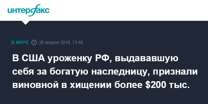 В США уроженку РФ, выдававшую себя за богатую наследницу, признали виновной в хищении более $200 тыс.