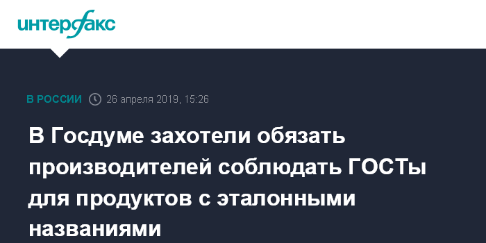 Москва. 26 апреля. INTERFAX.RU - Законопроект, обязывающий производителей соблюдать национальные стандарты при изготовлении продукции, которая имеет исторически сложившееся название, внесен в Госдуму.