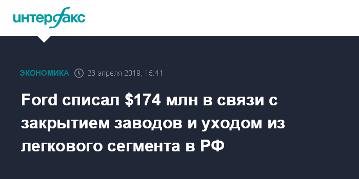 Москва. 26 апреля. INTERFAX.RU - Американский автоконцерн Ford списал $174 млн в I квартале 2019 г. в связи с реструктуризацией бизнеса в РФ, соответствующая сумма указана в разделе разовых расходов в презентации финансовых результатов компании за I квартал.