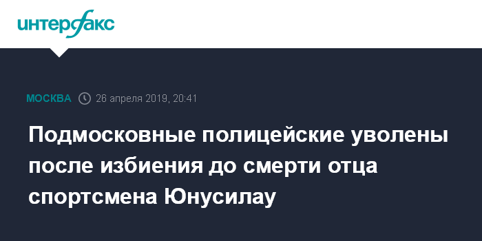Москва. 26 апреля. INTERFAX.RU - Уволены трое полицейских, задержанных по подозрению в избиении до смерти отца спортсмена Магомеда Юнусилау в подмосковном Орехово-Зуево, сообщила "Интерфаксу" начальник пресс-службы подмосковного главка МВД РФ Татьяна Петрова.