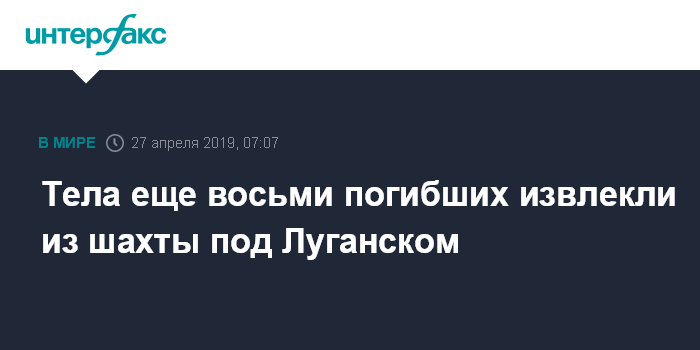 Москва. 27 апреля. INTERFAX.RU - Спасатели извлекли из-под завалов тела еще восьми горняков, погибших в результате аварии на шахте "Схидкарбон" под Луганском, судьба четырех шахтеров остается неизвестной, сообщает в субботу Луганский информационный центр со ссылкой на МЧС самопровозглашенной Луганской Народной Республики.
