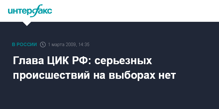 Москва. 1 марта. INTERFAX.RU - Никаких серьезных происшествий в регионах России, где проводятся выборы 1 марта, не зафиксировано, заявил глава Центризбиркома Владимир Чуров.