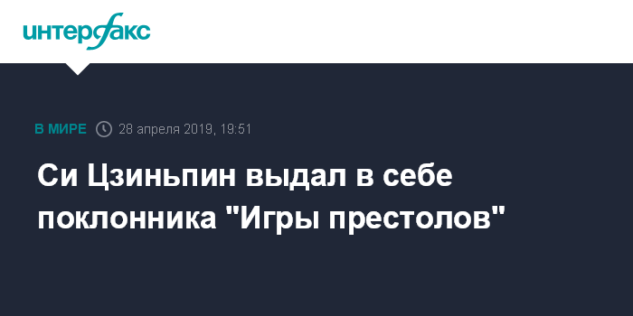 Москва. 28 апреля. INTERFAX.RU - Председатель КНР Си Цзиньпин оказался поклонником сериала "Игра престолов", последний сезон которого телеканал HBO начал показывать в середине апреля. Это выяснилось во время встречи китайского лидера с иностранной делегацией в Пекине, сообщает издание South China Morning Post со ссылкой на человека, присутствовавшего на переговорах.