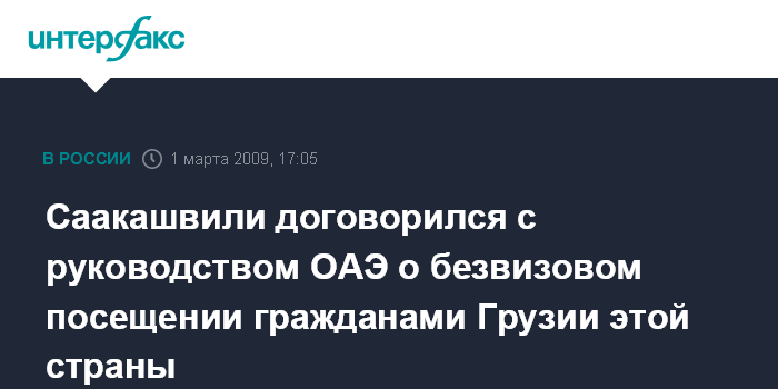 Как отмечается в сообщении пресс-службы президента Грузии, М.Саакашвили достиг на встречах с руководством ОАЭ соглашения о том, что граждане Грузии смогут посетить Арабские Эмираты, не оформляя визы.