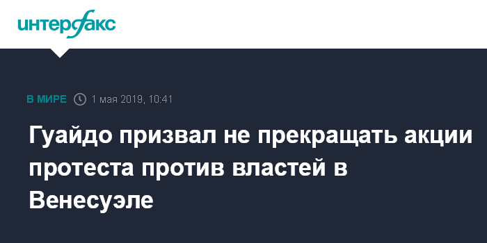 Москва. 1 мая. INTERFAX.RU - Лидер венесуэльской оппозиции Хуан Гуайдо призвал сторонников продолжить акции протеста против правительства.