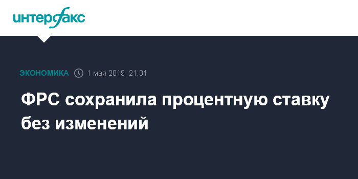 Москва. 1 мая. INTERFAX.RU - Федеральная резервная система (ФРС) по итогам заседания, проходившего 30 апреля и 1 мая, сохранила процентную ставку по федеральным кредитным средствам (federal funds rate) в диапазоне от 2,25% до 2,5% годовых, говорится в коммюнике Федерального комитета по открытым рынкам (FOMC).