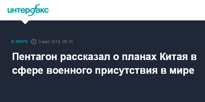 Москва. 3 мая. INTERFAX.RU - Китай планирует расширять свое военное присутствие в мире за счет строительства новых зарубежных военных баз, что обусловлено необходимостью защиты инвестиций в реализуемую Пекином программу "Один пояс, один путь", считает Пентагон.