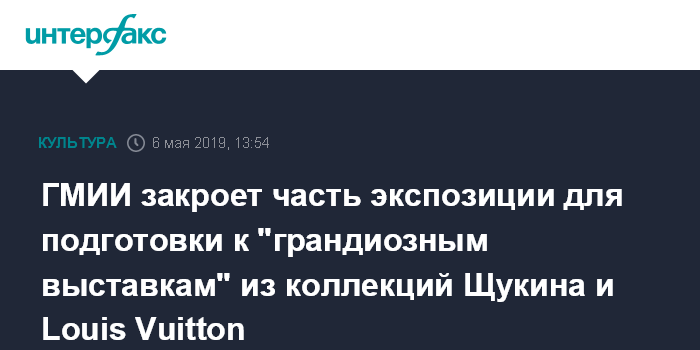 "ГМИИ готовится к открытию двух главных выставок летнего сезона - "Щукин. Биография коллекции" и "Коллекция Fondation Louis Vuitton. Избранное". Для реализации грандиозного замысла музей с 14 мая по 18 июня закроет Галерею искусства стран Европы и Америки XIX-XX веков и часть экспозиции Главного здания для подготовки проектов. В Главном здании будут закрыты для посещения залы Античного искусства и Европейского искусства V-XIX веков (залы 16-29)", - говорится в сообщении пресс-службы музея в понедельник.