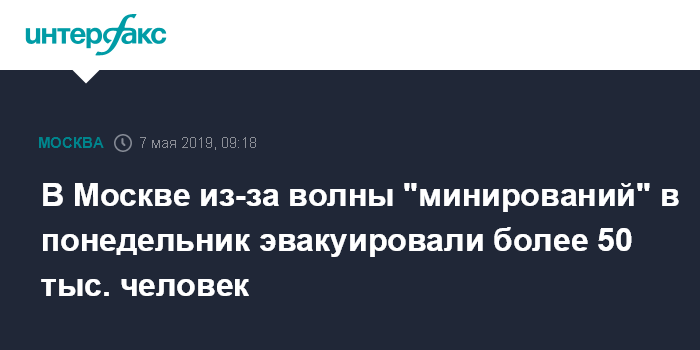 Москва. 7 мая. INTERFAX.RU - Сообщения от неизвестных с угрозами взрывов поступили в адрес свыше 50 объектов Москвы в понедельник, 6 мая, сообщил во вторник "Интерфаксу" источник, знакомый с ситуацией.