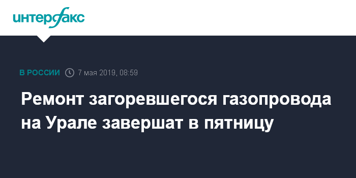 Москва. 7 мая. INTERFAX.RU - ООО "Газпром трансгаз Югорск", как ожидается, к концу пятницы завершит восстановительные работы на магистральном газопроводе в Свердловской области, сообщает ситуационно-аналитический центр Минэнерго России.