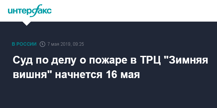Москва. 7 мая. INTERFAX.RU - Рассмотрение дела о пожаре в кемеровском торгово-развлекательном центре "Зимняя вишня" по существу назначено на 16 мая, сообщил судья Николай Быданцев на техническом заседании во вторник.